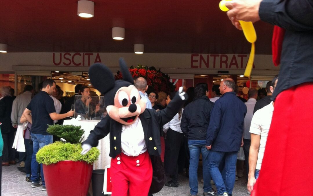 Mascotte disney Topolino insieme ai trampolieri accolgono le persone