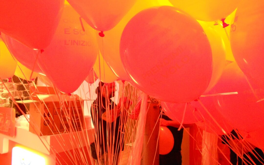 addobbo inaugurazione preparativi per l’inaugurazione, ragazzi e ragazze gonfiano migliaia di palloncini arancioni