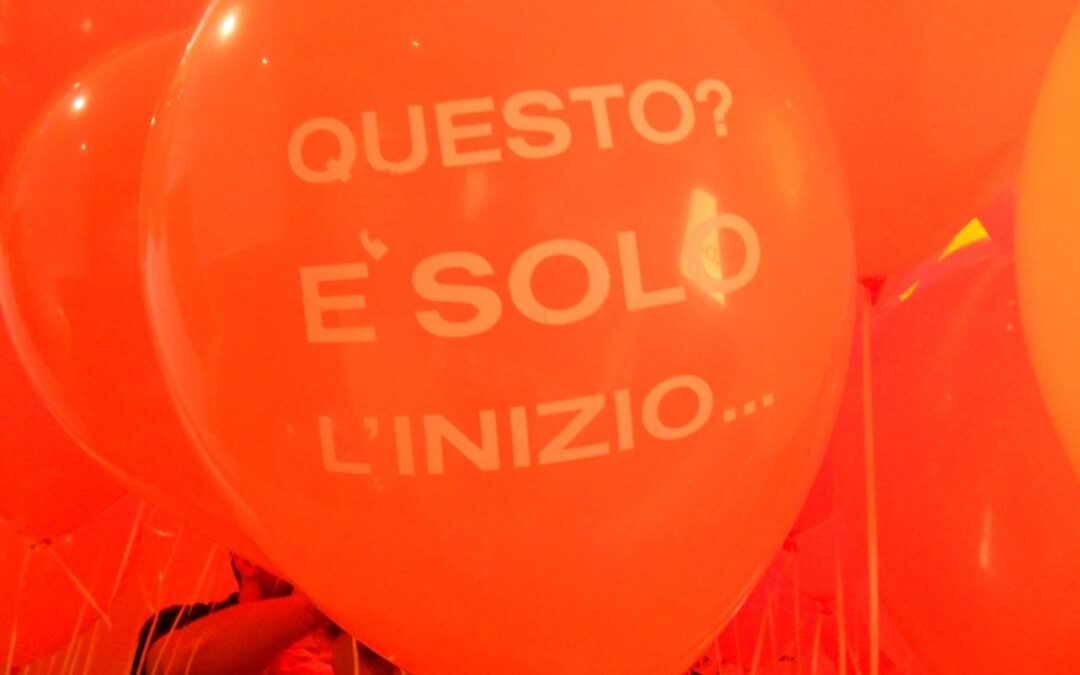 addobbo palloncini palloncino arancione in lattice con lo slogan dell’evento “questo?è solo l’inizio!”