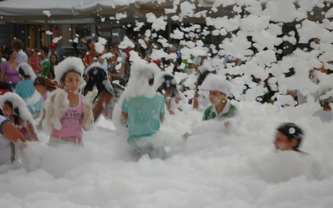 ragazzi e ragazze ballano in mezzo alla schiuma in piazza a Cividale