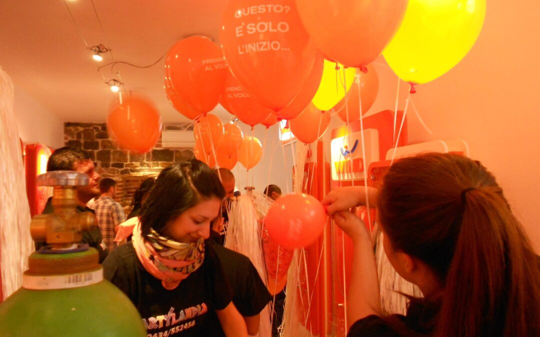 inaugurazione preparativi per allestire l’inaugurazione: ragazzi gonfiano migliaia di palloncini ad elio