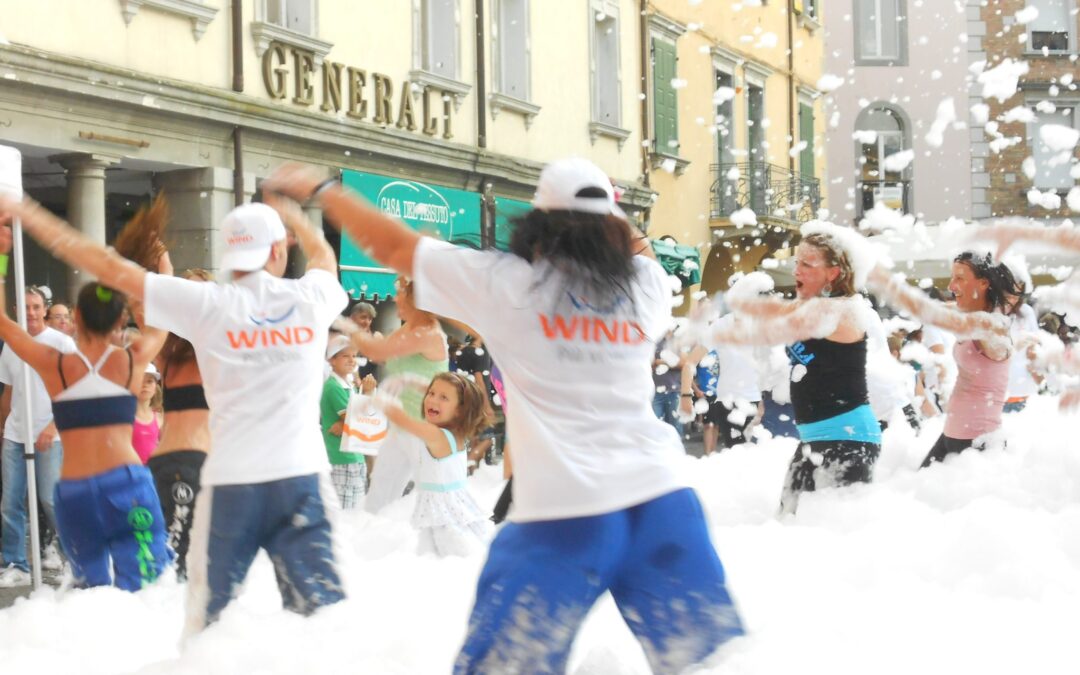 ragazzi con la divisa Wind ballano in mezzo alla schiuma