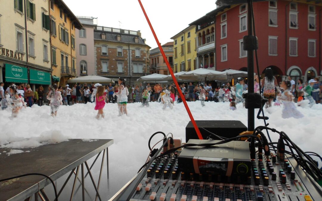 service evento veneto ragazzi e ragazze ballano in mezzo alla schiuma in piazza a Cividale e particolare di un service